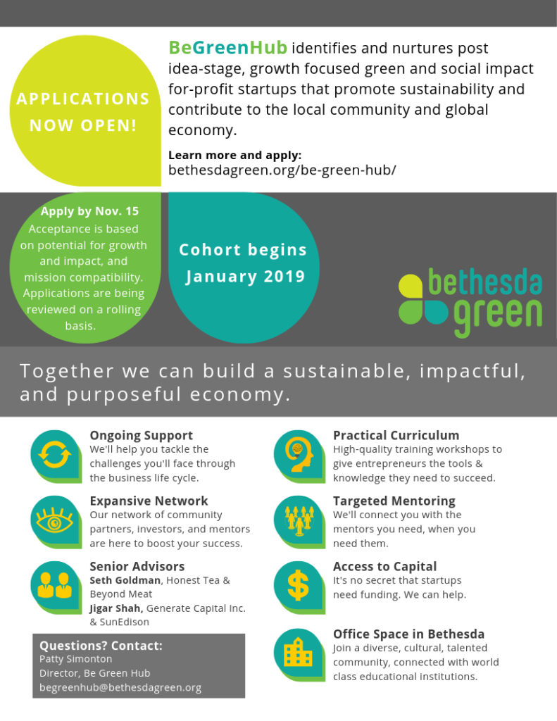 Be Green Hub identifies and nurtures green, social impact for-profit start-ups. We are looking for businesses aligned with their vision for a sustainable, impactful, and purposeful economy. (Download recruitment flyer) Details about the application process can be found here. Applications are due November 15th. We’re seeking companies that are: Post idea stage Pre/post revenue Growth focused via sales…